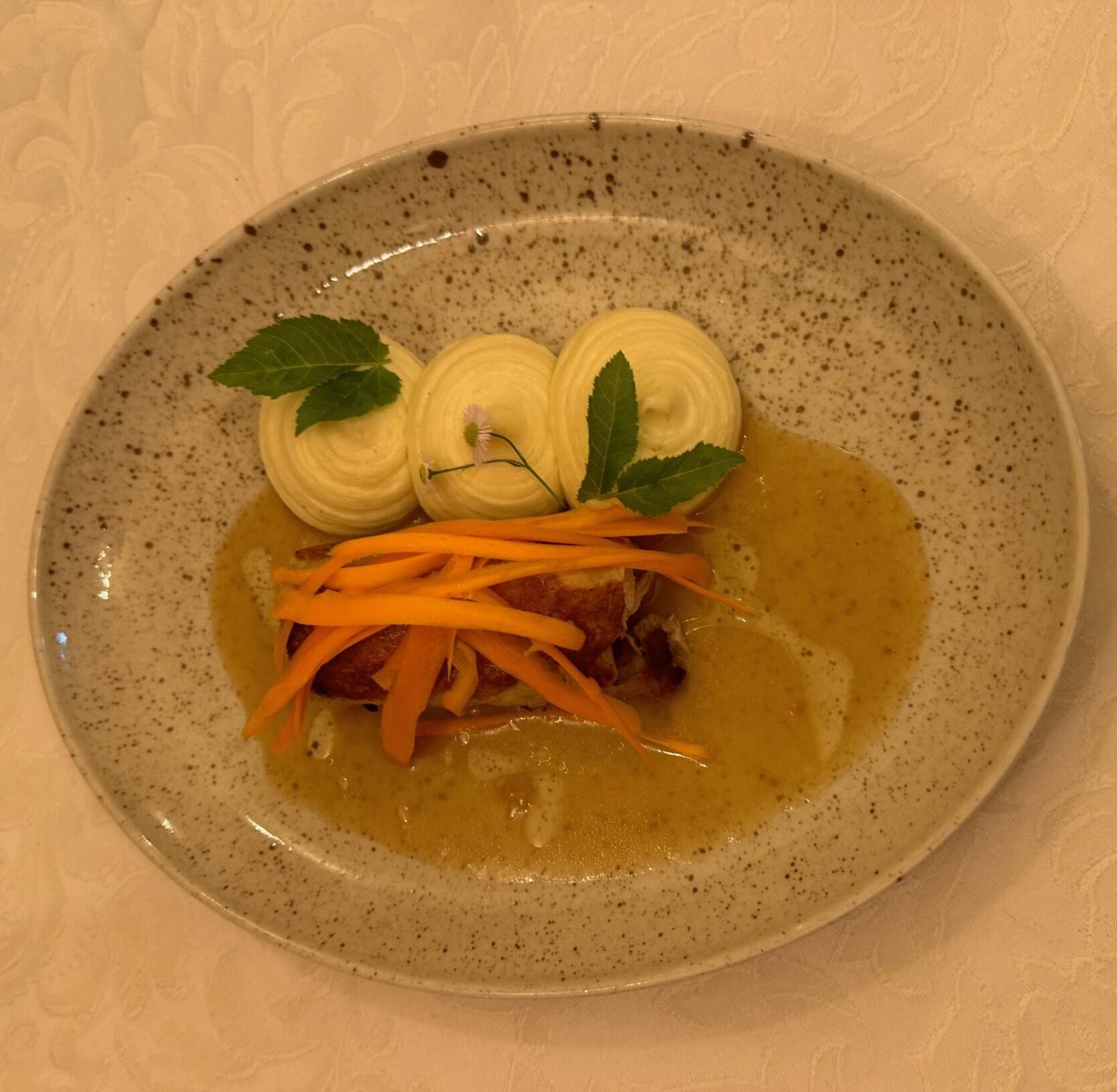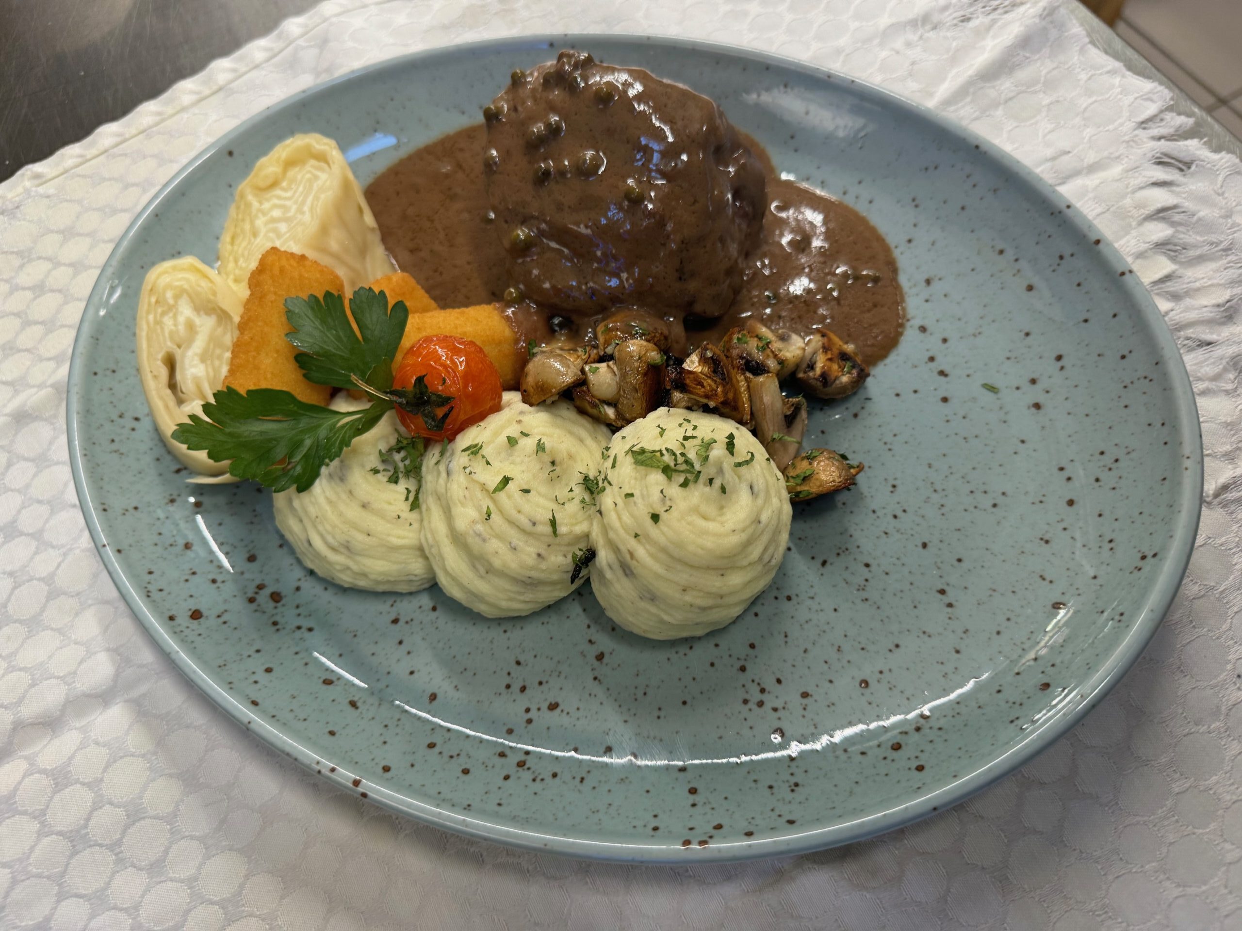 Meni Hladne predjed Kraški pršut z olivami 11,50€ Plošča mešanih sirov (mozzarella, edamec, parmezan, med, mleti orehi) 10,50€ Juhe Goveja juha z rezanci 4,00€ Gobova juha 4,00€ Česnova juha s kruhovimi kockami 4,00€ Ribje jedi Gratinirani lignji 16,00€ Ocvrti lignji s pomfrijem 14,00€ Lignji na žaru z blitvo in krompirjem 15,00€ File postrvi na žaru(z zelenjavo z žara in zeliščnim krompirčkom) 16,00€ Gratinirane dagnje(s paradižnikom in česnov kruh) 16,00€ Mesne jed File mignon v poprovi omaki(s sirovimi štruklji) 25,00€ Polnjena piščančja bedra(s šparglji, naravna omaka, pire krompir) 18,00€ Borovniški zrezek(puranji / svinjski, polnjen s šunko in sirom, gobova omaka, sirovi štruklji / ocvrti kroketi) 17,50€ Svinjska pečenka z žlikrofi 15,00€ Dunajski zrezek s pomfrijem(svinjski ali piščančji) 13,00€ Ocvrti piščančji trakci(v cornflaks skorjici ali panko skorjici s prilogo coctail omaka) 14,00€ Zrezek v omaki s prilogo(piščančji / svinjski, v gobovi, naravni, smetanovi) 14,00€ Hišna plošča za dva(piščančji zrezek po dunajsko, svinjski medaljon v gobovi omaki, goveji file v poprovi omaki, sirovi štruklji, zeliščni krompir, zelenjava z žara) 36,00€ Žar ponudba Steak na žaru(zeliščni krompirček, čimi čuri omaka) 22,00€ Pleskavica v lepinji z žar prilogo 11,00€ Čevapčiči v lepinji z žar prilogo(10 kom) 11,00€ Piščančji ražnjiči s pomfrijem 10,50€ Žar plošča za dva(čevapčiči, pleskavice, svinjski medaljon, pekoče klobasice, pomfri, žar priloga) 30,00€ Testenine Špageti / široki rezanci / fuži / njoki / rigatoni(bolognese, carbonara, gobova, kremna s tartufom, smetanova) 12,50€ Polnjena piščančja bedra(s šparglji, naravna omaka, pire krompir) 18,00€ Vegetarijanske jedi Ocvrt sir s pomfrijem 10,50€ Zelenjavni krožnik(zelenjava z žara, ocvrt sir, spomladanski zavitki, sirov štrukelj, gobova omaka, pečen krompirček) 11,00€ Spomladanski zavitki na rukoli s parmezanom(coctail omaka) 9,50€ Ocvrti piščančji trakci(v cornflaks skorjici ali panko skorjici s prilogo coctail omaka) 14,00€ Zrezek v omaki s prilogo(piščančji / svinjski, v gobovi, naravni, smetanovi) 14,00€ Hišna plošča za dva(piščančji zrezek po dunajsko, svinjski medaljon v gobovi omaki, goveji file v poprovi omaki, sirovi štruklji, zeliščni krompir, zelenjava z žara) 36,00€ Burgerji Klasik(sezamova bombetka, goveja pleskavica, coctail omaka, solatka, paradižnik, kisle kumarice, sir in krompirček) 10,00€ Godec(sezamova bombetka, goveja pleskavica, coctail omaka, solatka, paradižnik, čebula, kisle kumarice, slanina, jajce sir in krompirček) 11,00€ Piščančji(sezamova bombetka, piščančji dunajski, coctail omaka, solatka, kisle kumarice in krompirček) 10,00€ Piščančji ražnjiči s pomfrijem 10,50€ Žar plošča za dva(čevapčiči, pleskavice, svinjski medaljon, pekoče klobasice, pomfri, žar priloga) 30,00€ Priloge Pražen krompir 3,50€ Zelenjava žar 3,50€ Sirovi štruklji 3,50€ Ocvrti kroketi 3,50€ Pomfri 3,50€ Zeliščni krompirček 3,50€ Solatni krožnik Kraljeva solata(mešana solata ,paradižnik ,fižol, koruza ,sir, kisla smetana, šunka) 11,00€ Solata s piščancem(mešana solata, paradižnik, koruza, fižol, pečen piščanec, cocktail omaka) 12,00€ Grška solata(paradižnik, sveže kumare, feta, olive, šalotka, olivno olje, origano) 9,00€ Sladice Tiramisu 4,50€ Panna cotta z pomarančo 4,50€ Palačinke (nutela / čokolada / marmelada) prelite s karamelo 6,50€